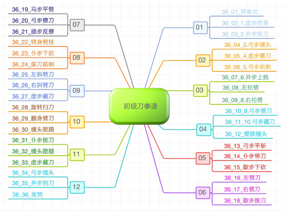 初级到刀拳谱分12组,每组三个动作,共计36个动作。